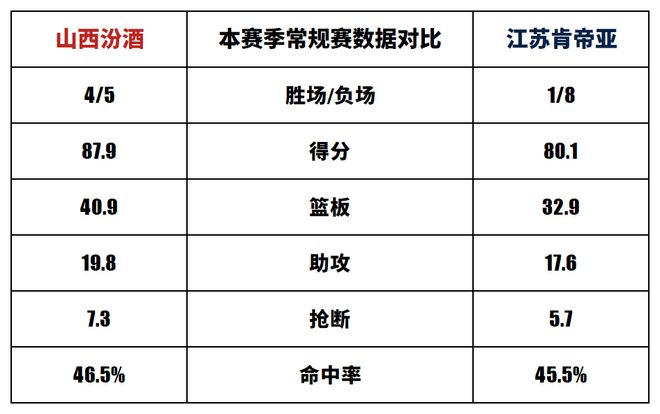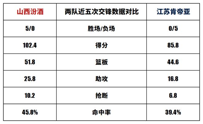 山西汾酒与江苏肯帝亚历史上一共交手39次,山西汾酒23胜16负。上赛季两队交手2次,山西汾酒2胜0负。
