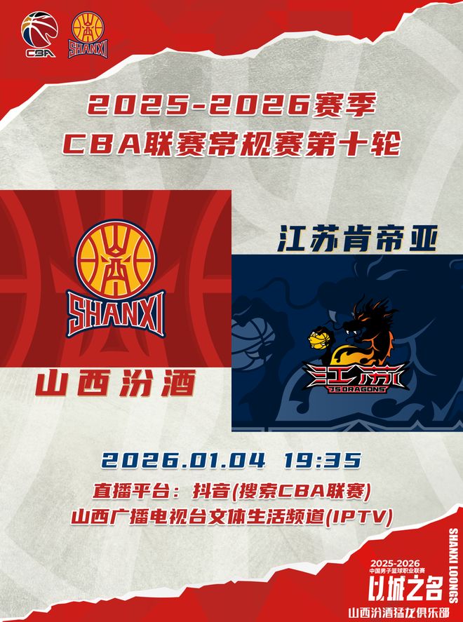 北京时间2026年1月4日19:35,2025-2026赛季CBA联赛常规赛第十轮继续进行,山西汾酒继续坐镇主场,迎战江苏肯帝亚,球迷观众可以通过抖音(搜索CBA联赛)、山西广播电视台文体生活频道(IPTV)观看比赛实况,敬请期待!