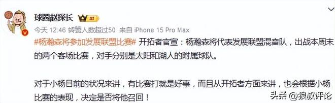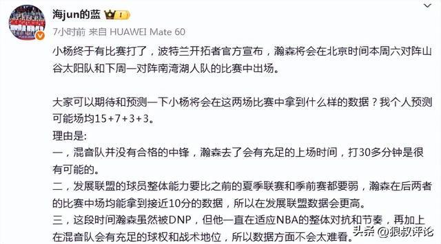 媒体人“海jun的蓝”更新社媒发文点评:“小杨终于有比赛打了,波特兰开拓者官方宣布,瀚森将会在北京时间本周六对阵山谷太阳队和下周一对阵南湾湖人队的比赛中出场。