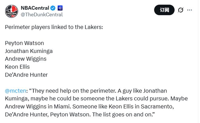 北京时间1月23日,湖人名记麦克米纳明在节目上谈到了球队的补强方向,提到了五个侧翼的名字。
