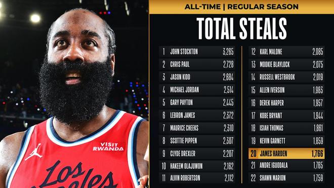 需要关注的是,当对手在末节轰出19比7的攻势将分差缩小至2分之际,哈登命中了远投帮助快船稳住了局面。值得一提的是,哈登还在此役创下了纪录。此役之后,哈登已经拿到生涯第1766个抢断。哈登生涯抢断数正式超越伊戈达拉,升至NBA历史抢断榜第20位,下一个追逐名宿凯文加内特(1859)。