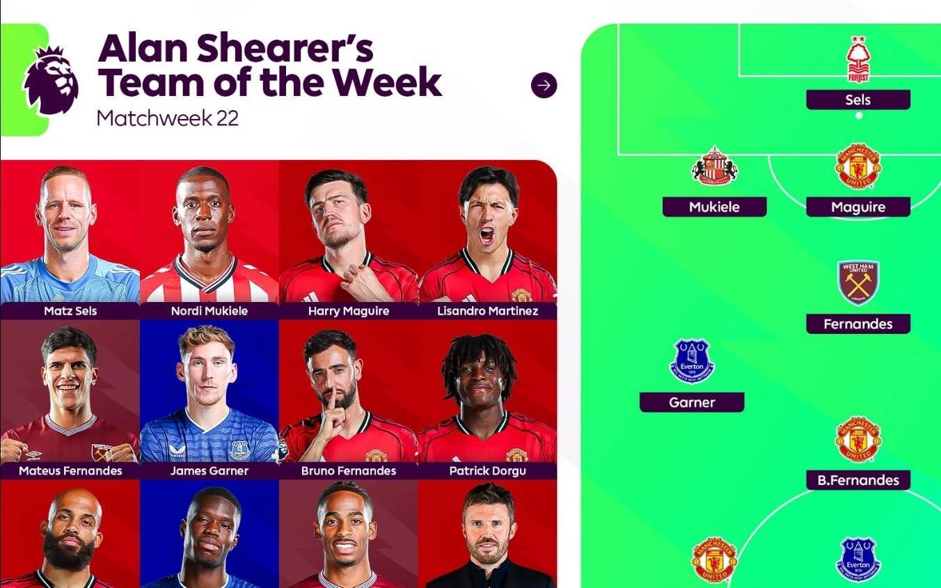 希勒评英超第22轮最佳阵:曼联5人在列,埃弗顿、西汉姆各2人