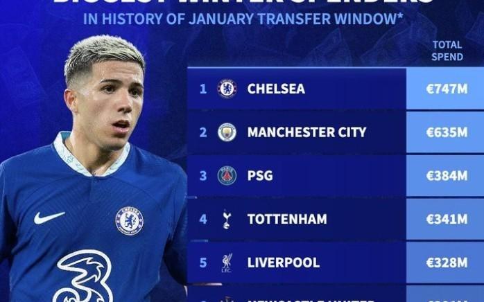冬窗历史转会支出榜:切尔西7.47亿欧居首,前十英超占8席
