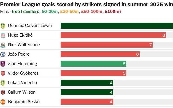 英超去年夏窗转会中锋联赛进球数:勒温居首,埃基蒂克第二