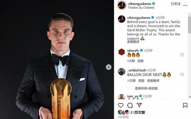 约克雷斯社媒:很荣幸获得盖德穆勒奖,进球凝聚着集体的力量