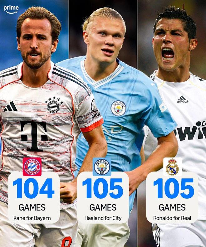 仅用104场比赛,凯恩便斩获了拜仁生涯100球,英格兰队长诠释了什么叫做效率?而凭借着这一表现,他也成为了21世纪为一支五大联赛球队打进100球最快的球员,此前的纪录保持者是C罗(皇家马德里)和哈兰德(曼城)。这两人都用了105场比赛,而凯恩将这一纪录提升至了104场比赛。