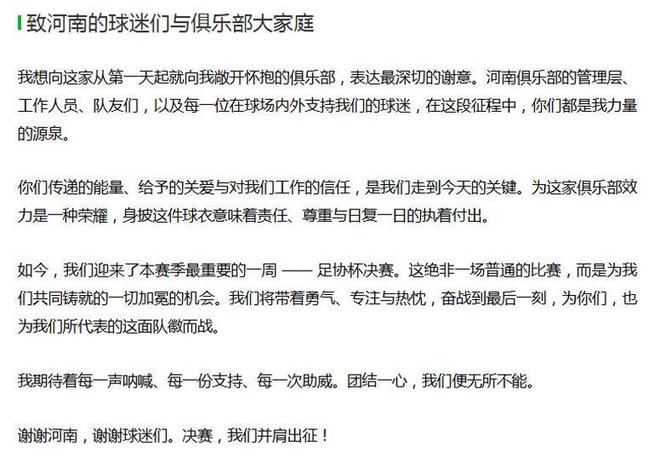 “为河南俱乐部效力是一种荣耀,身披这件球衣意味着责任、尊重与日复一日的执着付出。如今,我们迎来了本赛季最重要的一周——足协杯决赛。这绝非一场普通比赛,而是为我们共同铸就的加冕机会。我们将带着勇气、专注与热忱奋战到最后一刻,为你们也为队徽而战。我期待着每一声呐喊、每一份支持、每一次助威。团结一心,我们便无所不能。”